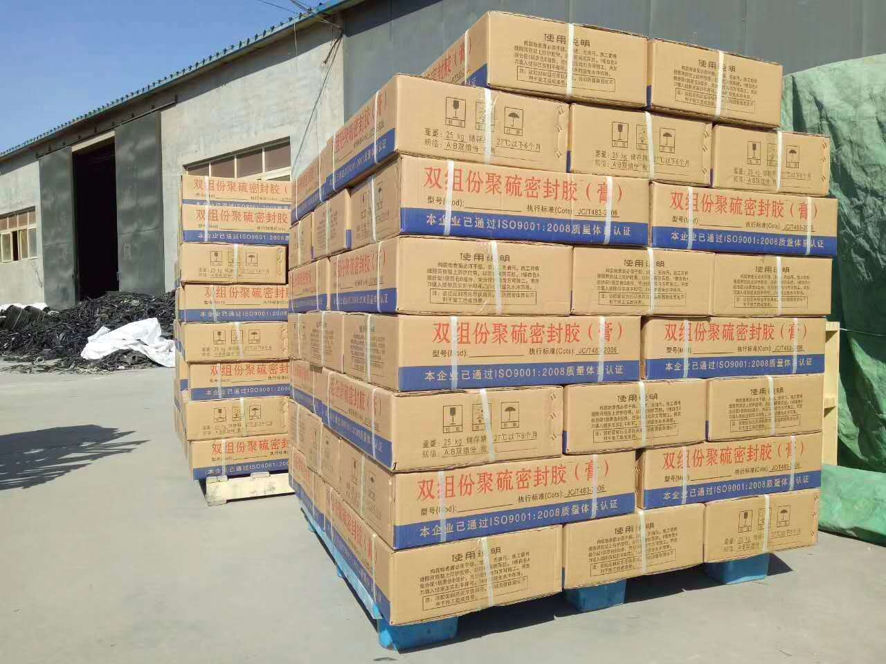 聚硫密封膏箱內(nèi)有一桶白聚硫膠和一桶黑固化劑充分攪拌均勻直到無色差為止。將雙組份聚硫密封的AB膠同時倒